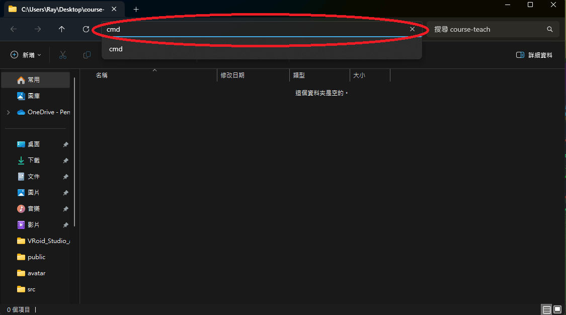 先建立一個空資料夾來前端與後端的檔案,打開資料夾,並在上方的位置列上輸入 cmd