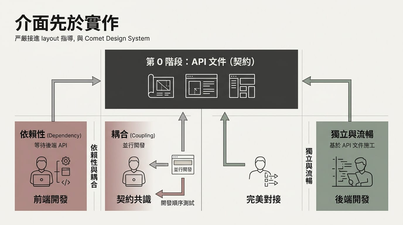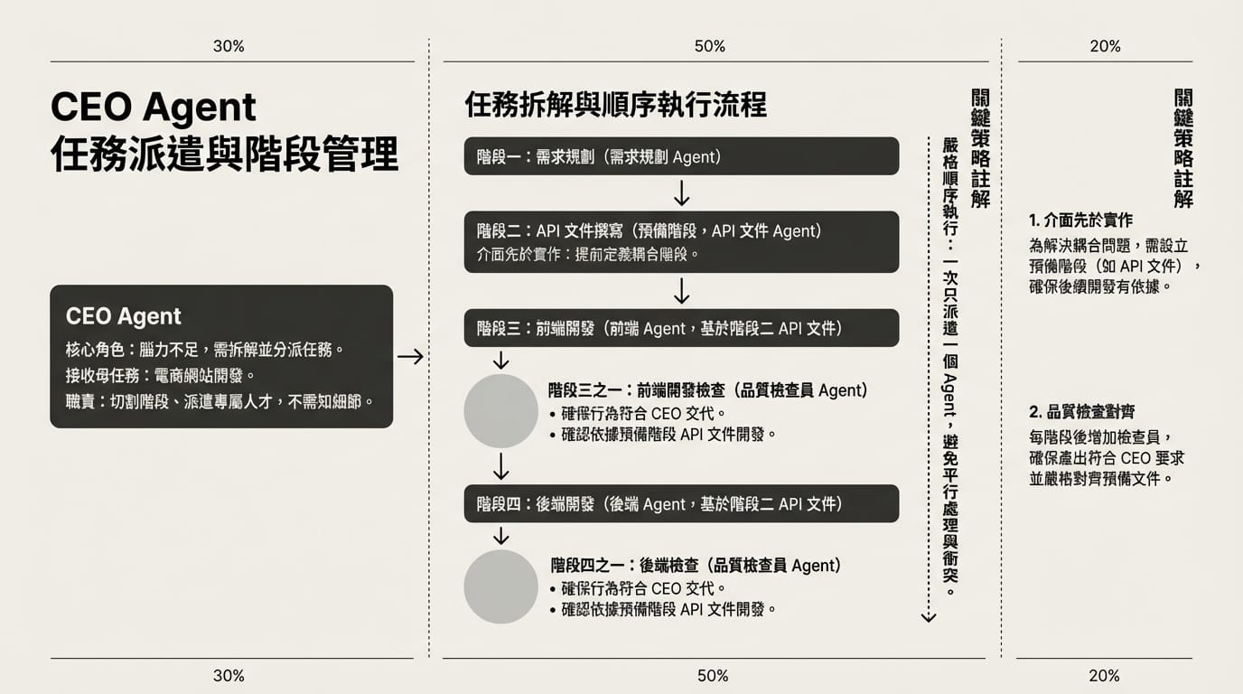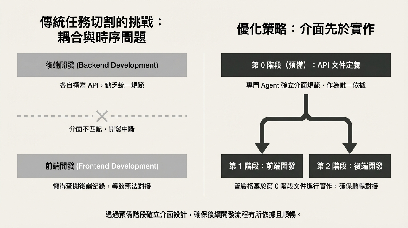 這就是為什麼我強調要有一個 『預備階段』。 針對這種會互相耦合的任務,CEO 必須具備 『介面先於實作』 的概念。我們先派一個 Agent 專門把 API 文件(契約)定下來,後續的前後端 Agent 就全部依照這份文件施工,互不干擾卻能完美對接。」