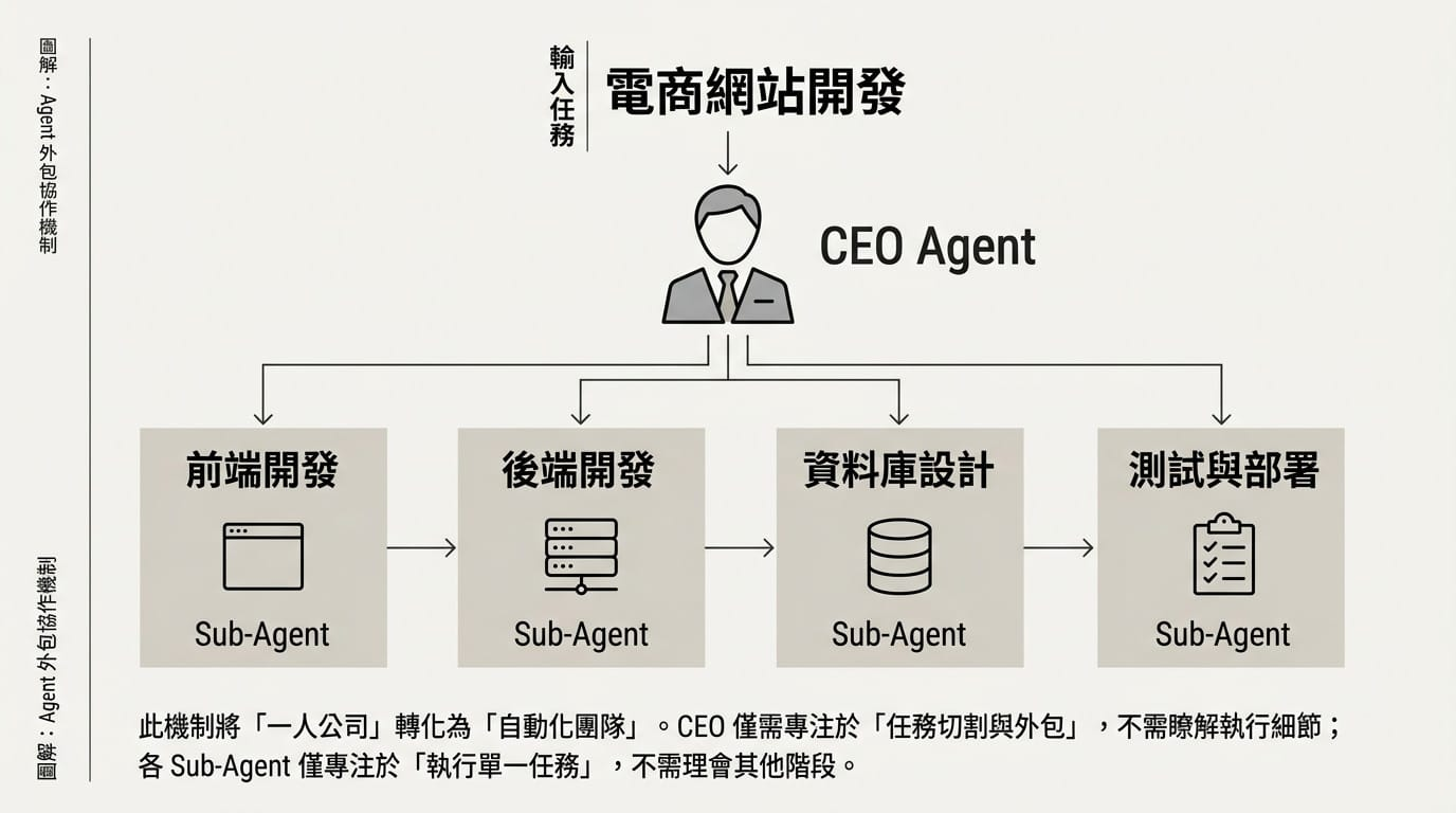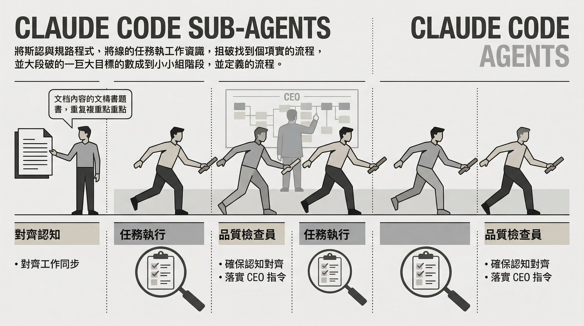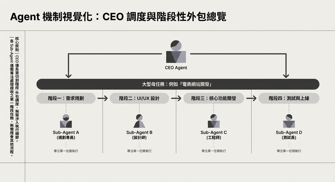 在實際的 AI 開發上,平行處理往往是災難的開始。如果讓兩個分身同時改同一個檔案,很容易產生程式碼衝突或邏輯覆蓋。 為了確保產出的穩定性,我們寧可慢,也要穩。我們採取『接力賽』的形式,一次只派遣一個工程師 Sub-Agent 專注處理一個階段,完成後再交棒給下一位。