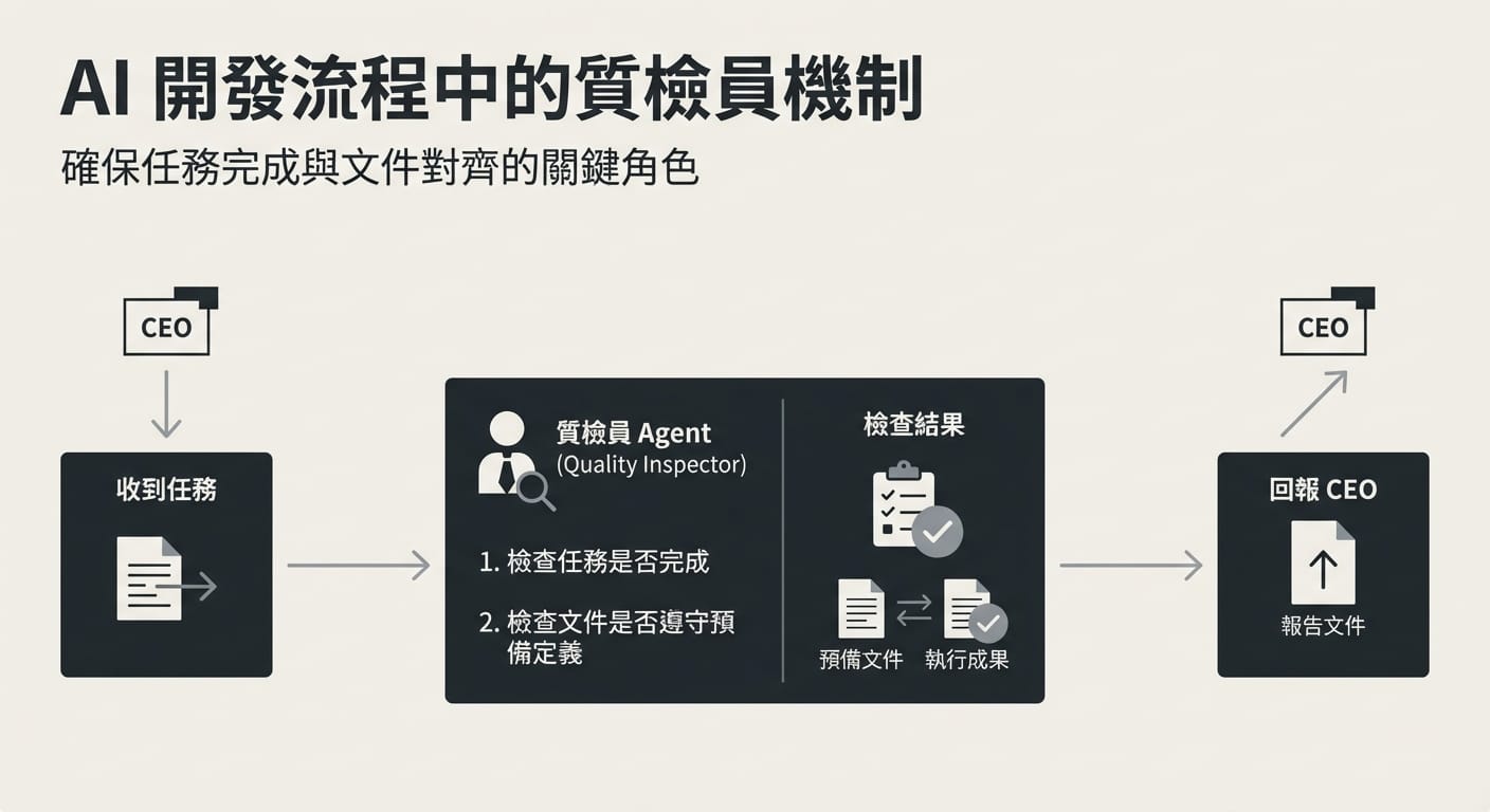 在任何階段開發完成後,CEO 應該多派遣一名「品質檢查員 Agent」進行檢查。