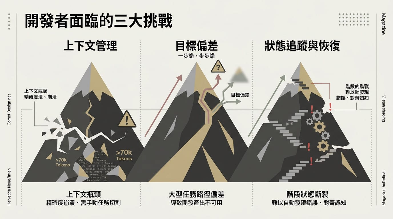 再來第二座大山,在面對超大型任務的情況下,Agent 很容易一步錯、步步錯。